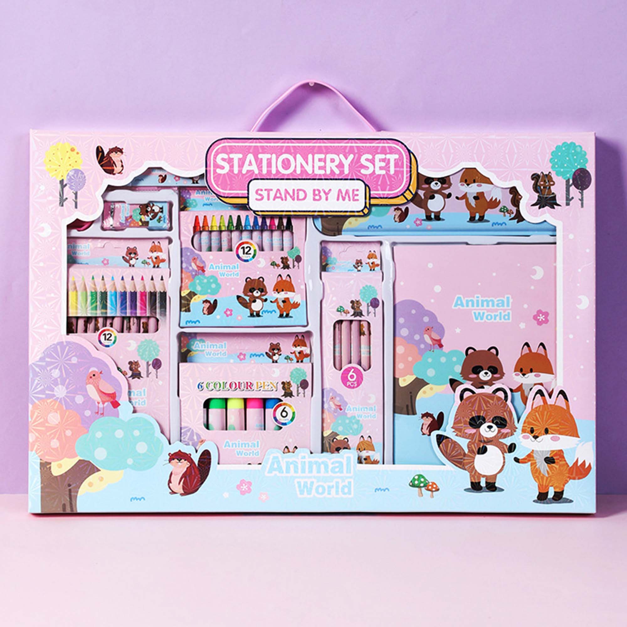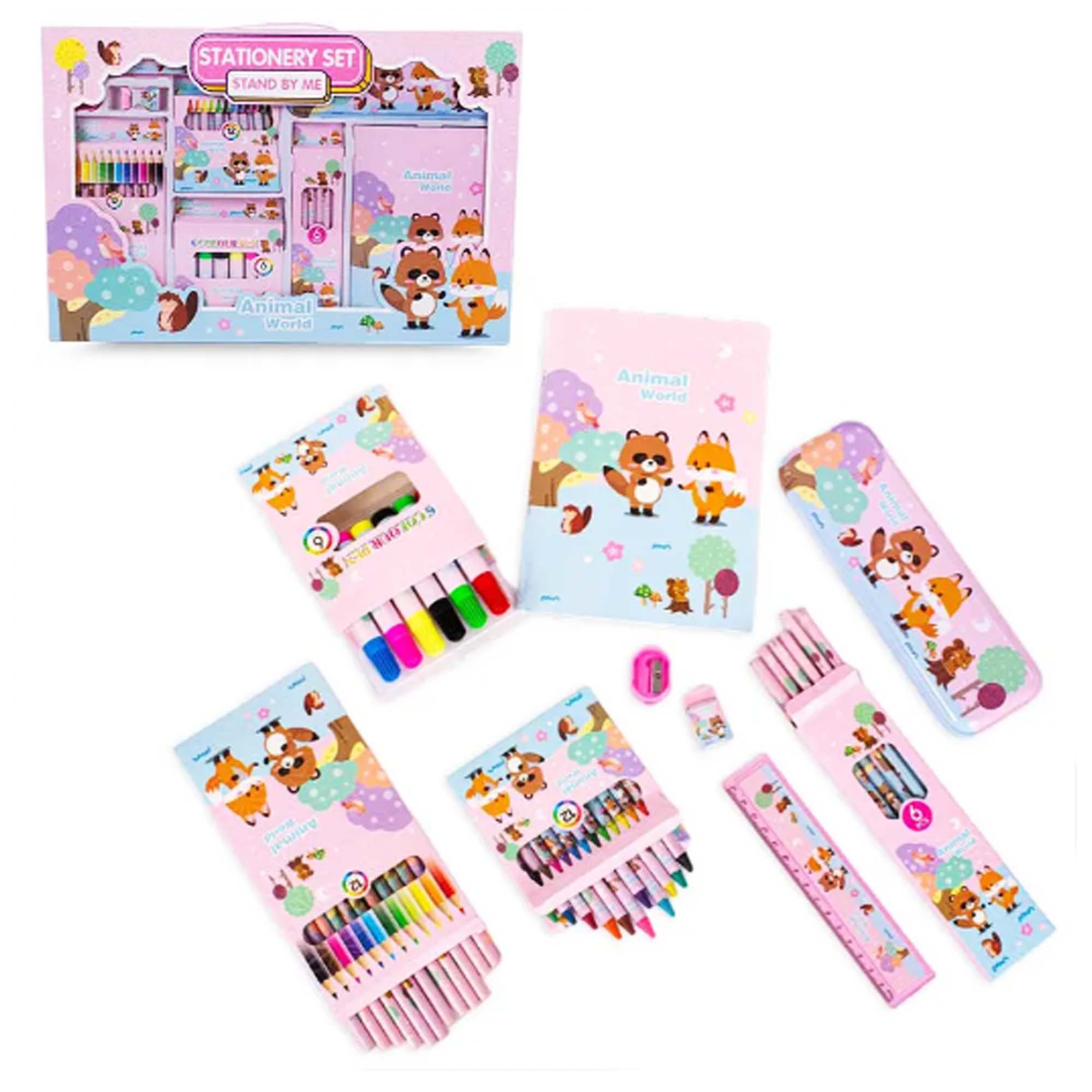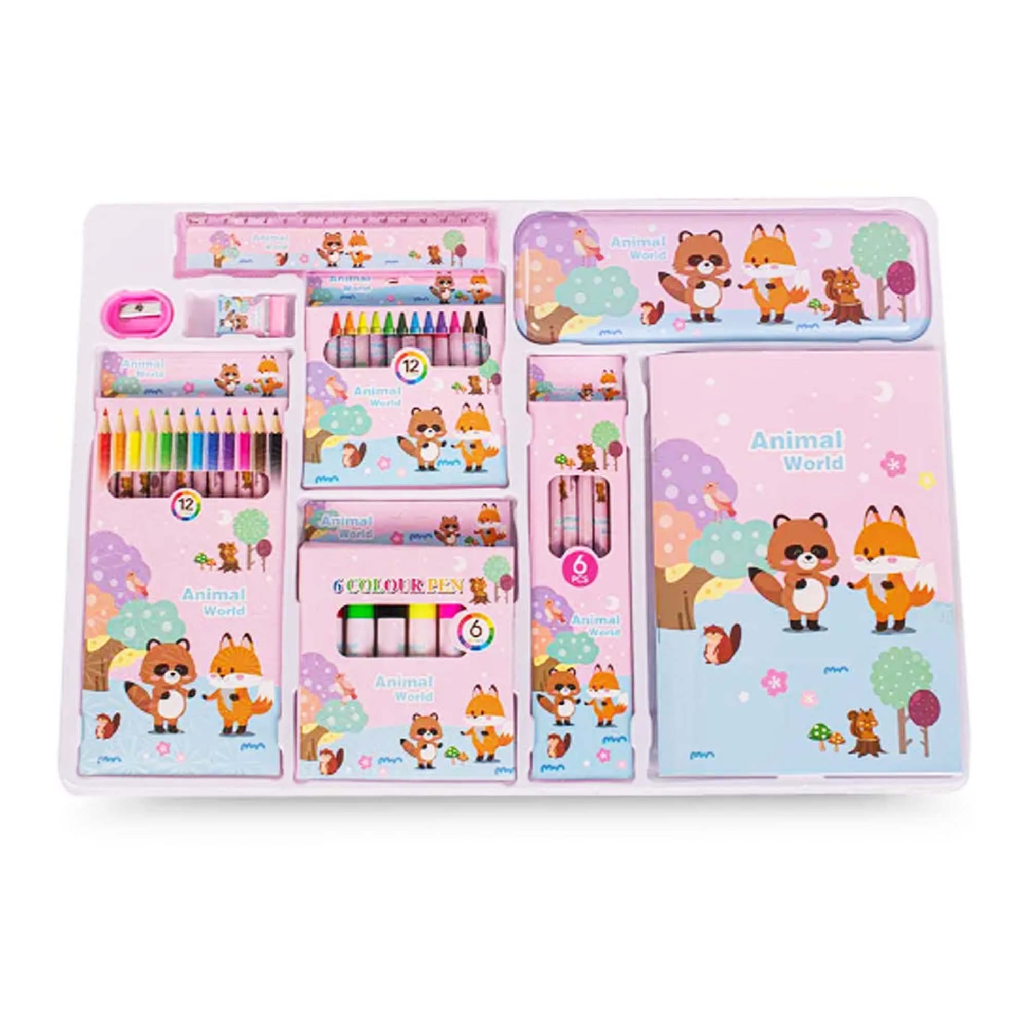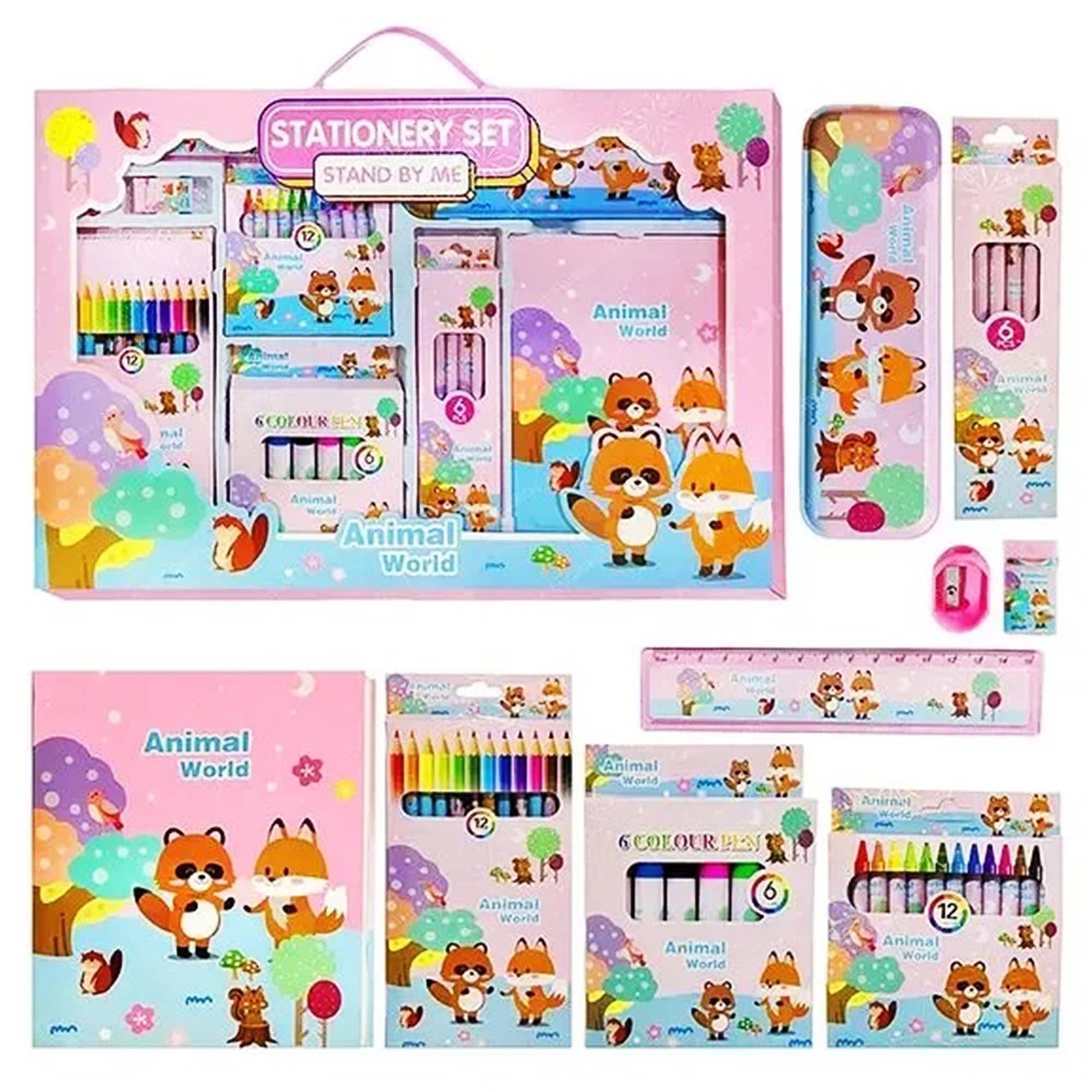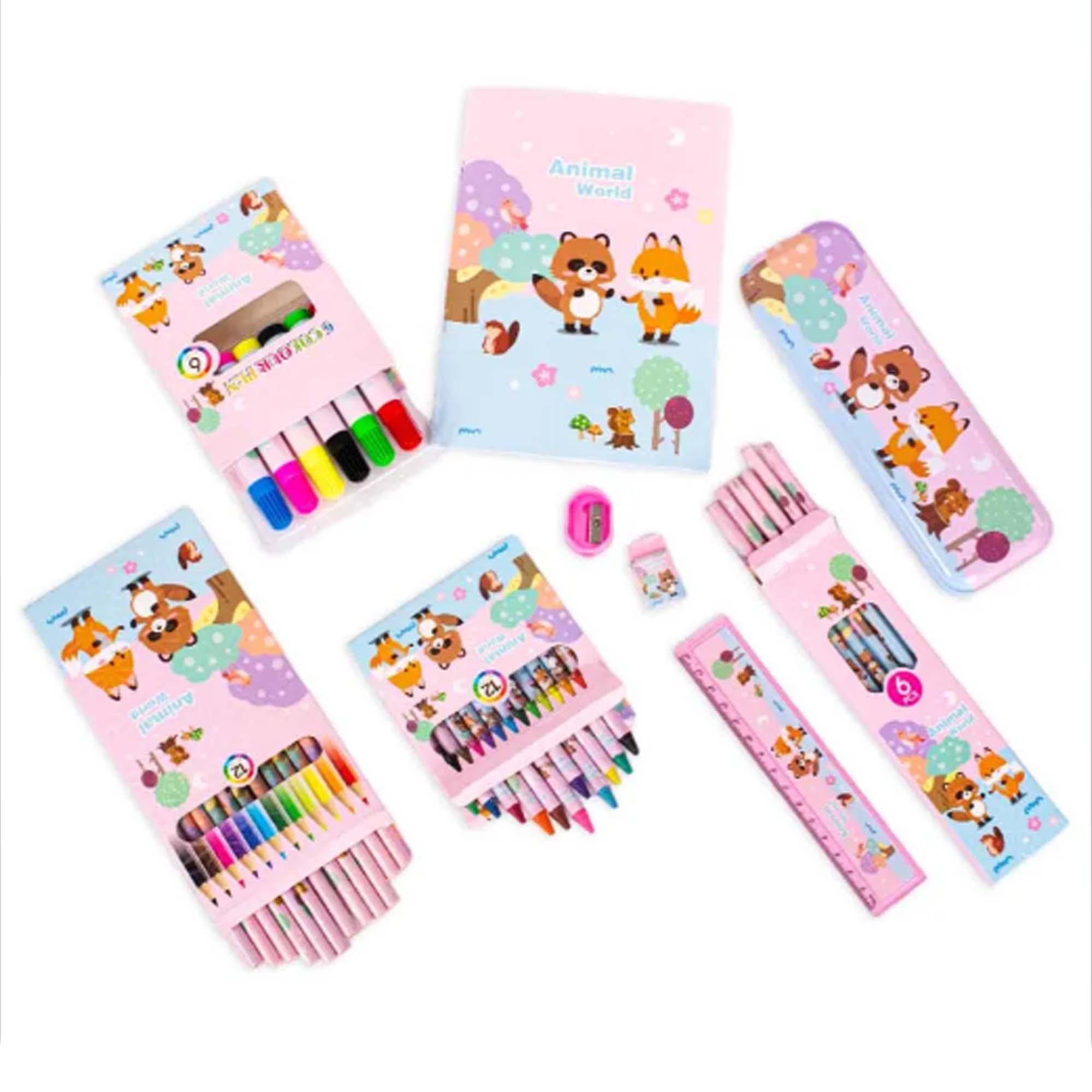 ۶ عدد ماژیک،۱۲ عدد پاستل شمعی،۱۲ عدد مداد رنگی،۶ عدد مداد مشکی،جامدادی،دفتر نقاشی 25برگ،پاکن،تراش،خطکش