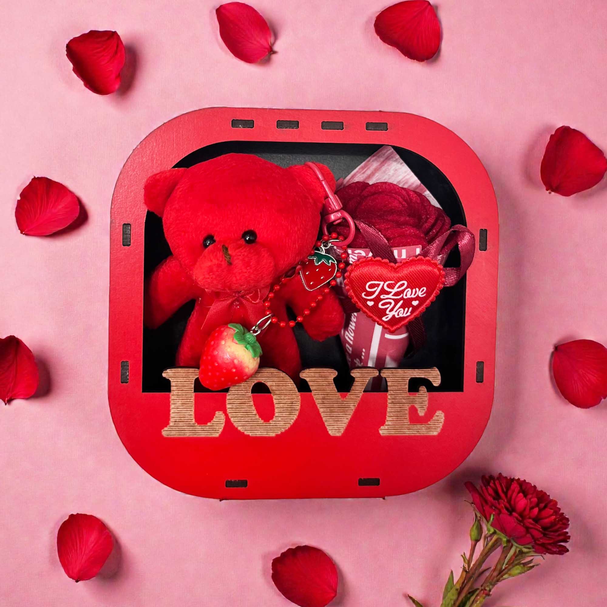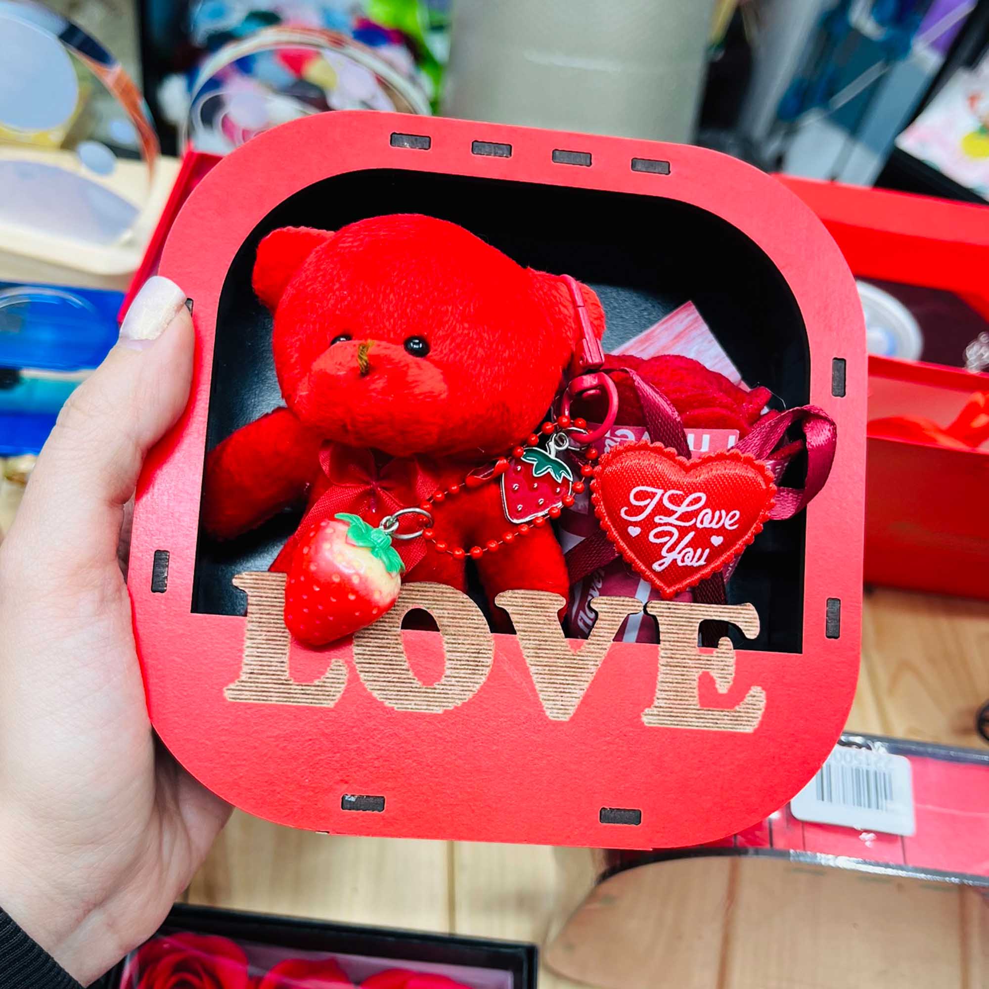این ست شامل: عروسک خرسی، آویز کیف توت فرنگی، دسته گل و باکس چوبی می باشد.
