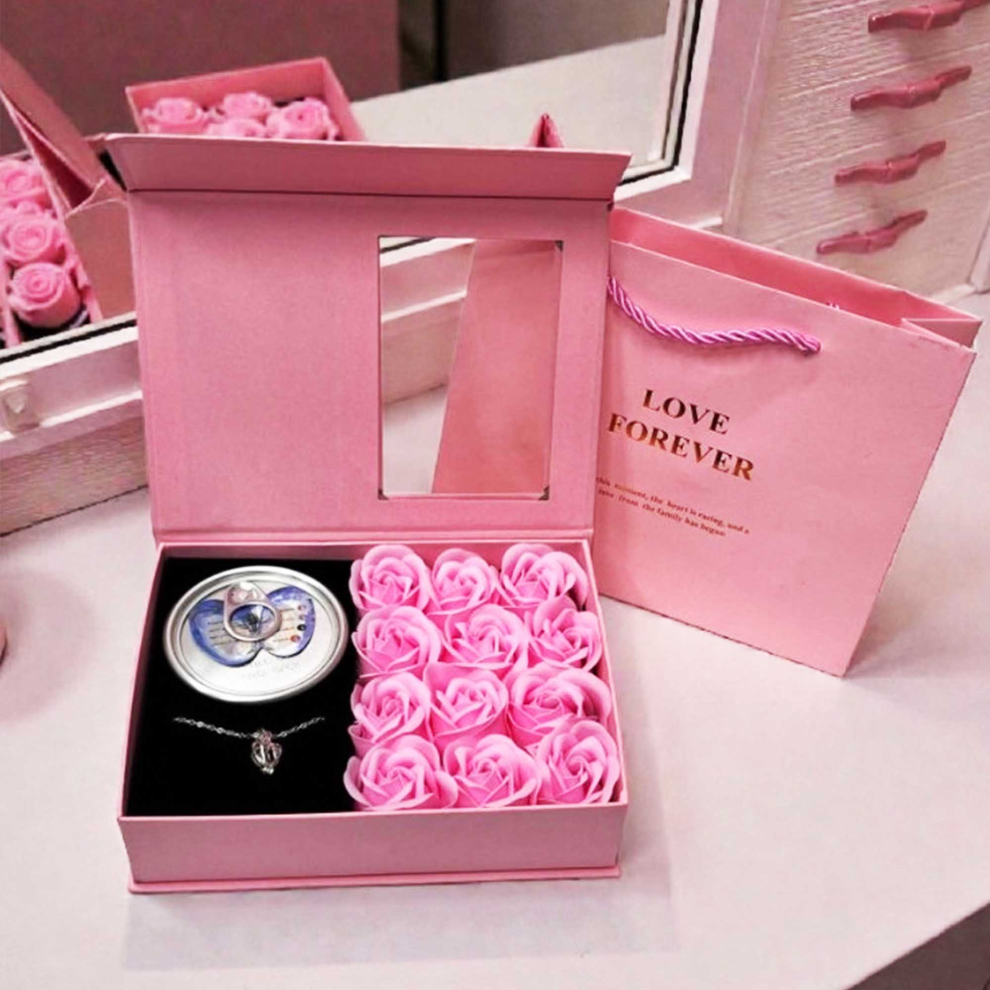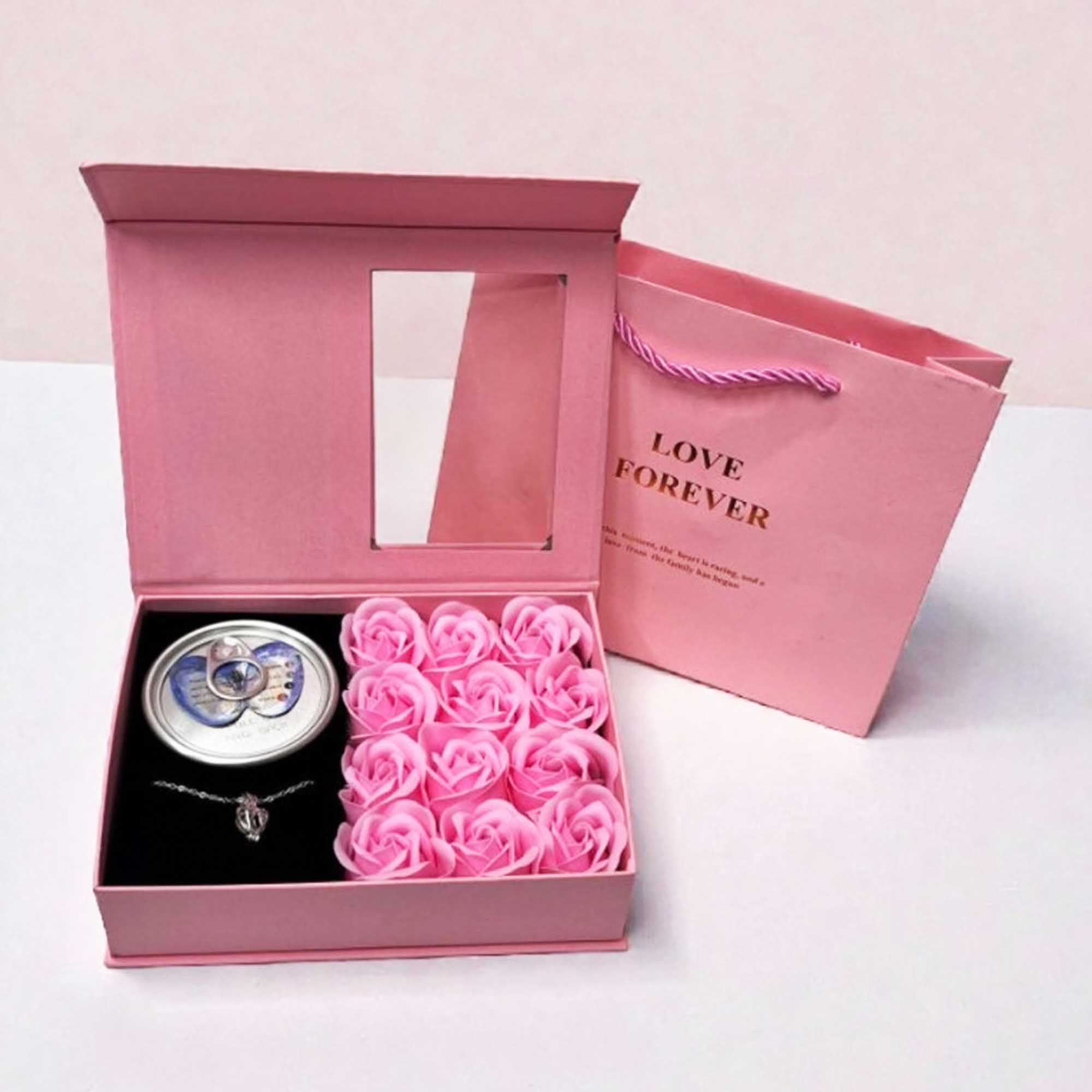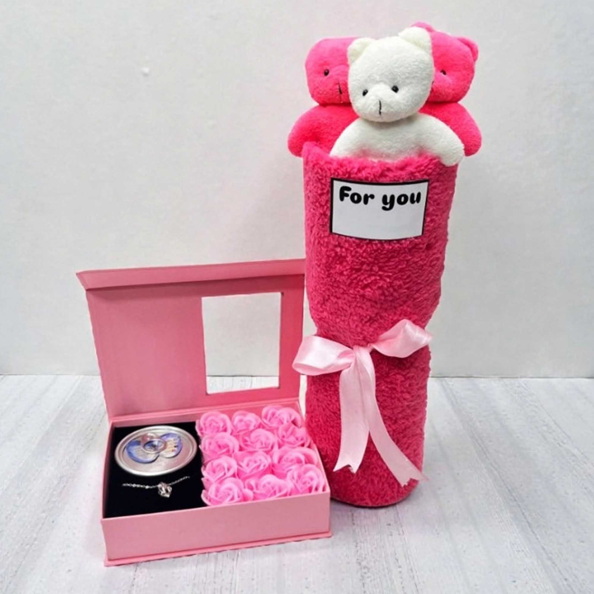 باکس مروارید عشق همراه گل معطر صابونی و بگ هدیه، دسته گل خرسی 3 عددی